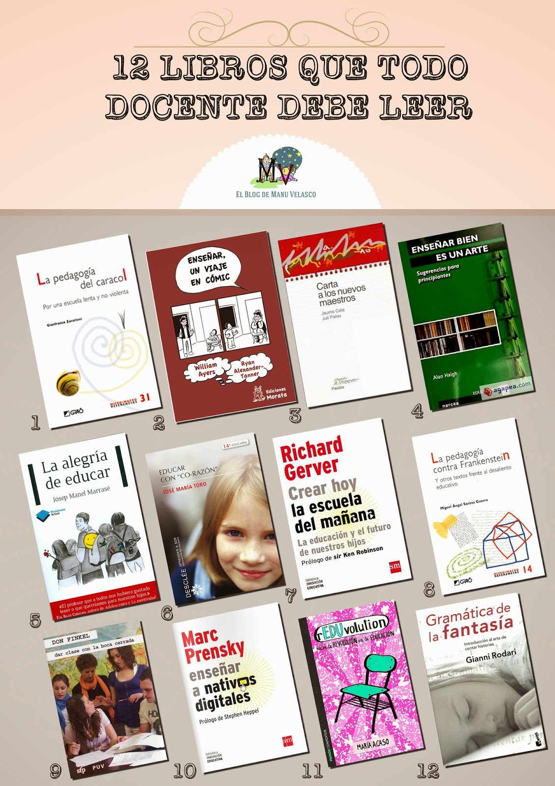 Una compilación muy acertada y también muy íntima en El Blog De Manu Velasco, nos da la oportunidad de profundizar en muchos y variados conceptos, de evolucionar y perfeccionar la pedagogía que se aplica día a día en las aulas. Son libros con diferentes temáticas y para diferentes niveles, son, como dice su autor, «aquellos que echarías en falta, que no podrías estar sin ellos, ya que te hablan al oído y te permiten aprender, crear».