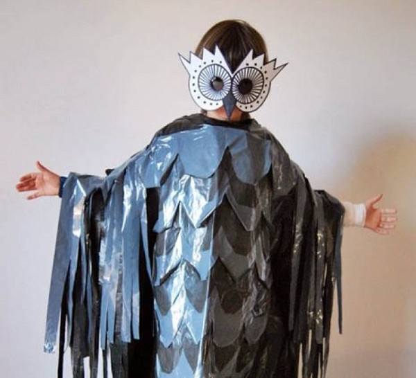 Incluso con un par de bolsas de basura puedes hacer un gran disfraz. Lo único que hay que hacer es coger dos bolsas grandes de basura, una en negro y la otra de un color gris y las unimos de modo que podamos formar el cuerpo de un búho. Con una cartulina puedes hacer la máscara y listo; ya tienes un disfraz reciclado y sin gastar demasiado dinero.