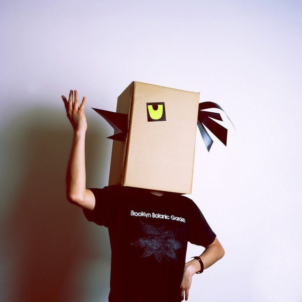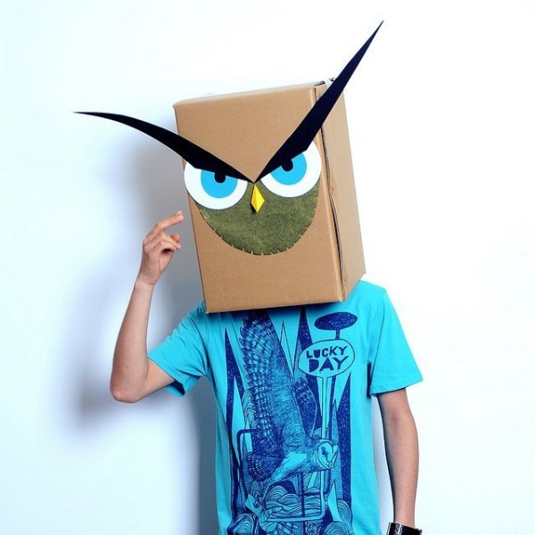 A partir de una sencilla caja de cartón, se ha conseguido tener una cabeza de pájaro. Necesitas una caja en la que te quepa la cabeza, y a la que le puedes hacer dos cortes para ver un poco (aunque en la foto no los tenga), pegas en cada lateral un poco de papel o de cartulina para recrear el pico y la parte de atrás y pintas o pegas algo en la parte central para que sea el ojo.