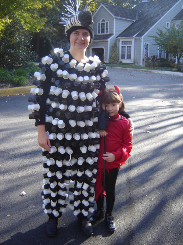 Este es un tipo de disfraz algo laborioso pero no imposible. Puedes pegar los vasos con un poco de silicona o de pegamento, aunque con la primera opción te quedarán fijos y nos los perderás aunque haga algo de viento. Puedes completar tu disfraz con una máscara de cebra o si lo prefieres, comprando un gorro que tenga la cabeza de este animal.