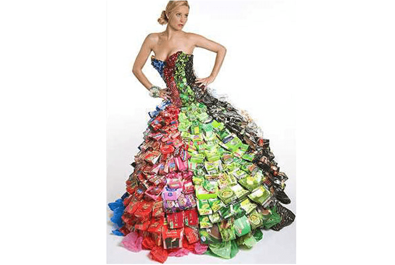 Los plásticos pueden convertirse en algo más que en futuro material reciclado, desde ser idóneos para elementos pequeños (hacer de botones, ojos…) a ser ellos mismos el protagonista de un disfraz, desde los pies a la cabeza, para convertirse en un vestido con volumen y lleno de color que no tiene nada que envidiar al de las pasarelas.